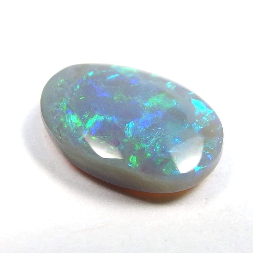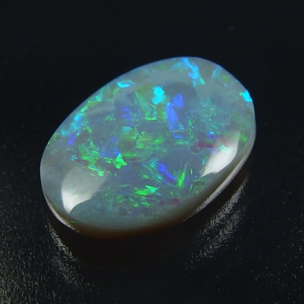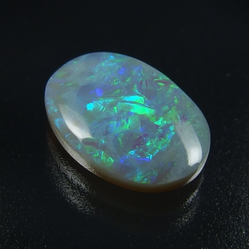 柔らかな地色に、グリーンとブルーの色が流れるように踊る、とても明るく美しい表情を見せてくれる ライトニングリッジ産ブラックオパールです。
