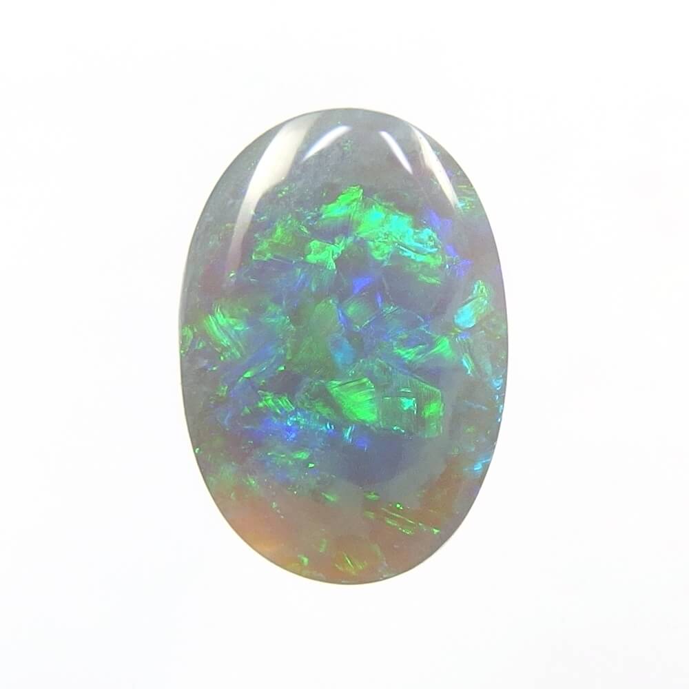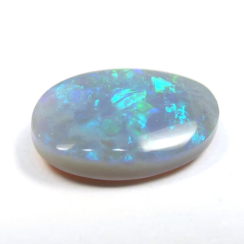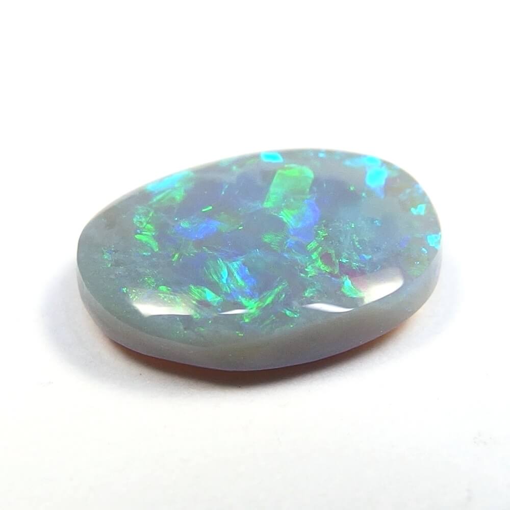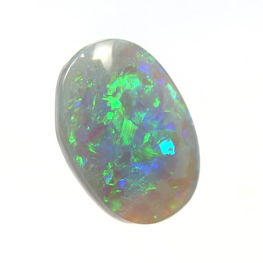 柔らかな地色に、グリーンとブルーの色が流れるように踊る、とても明るく美しい表情を見せてくれる ライトニングリッジ産ブラックオパールです。